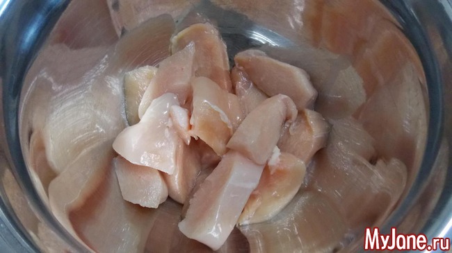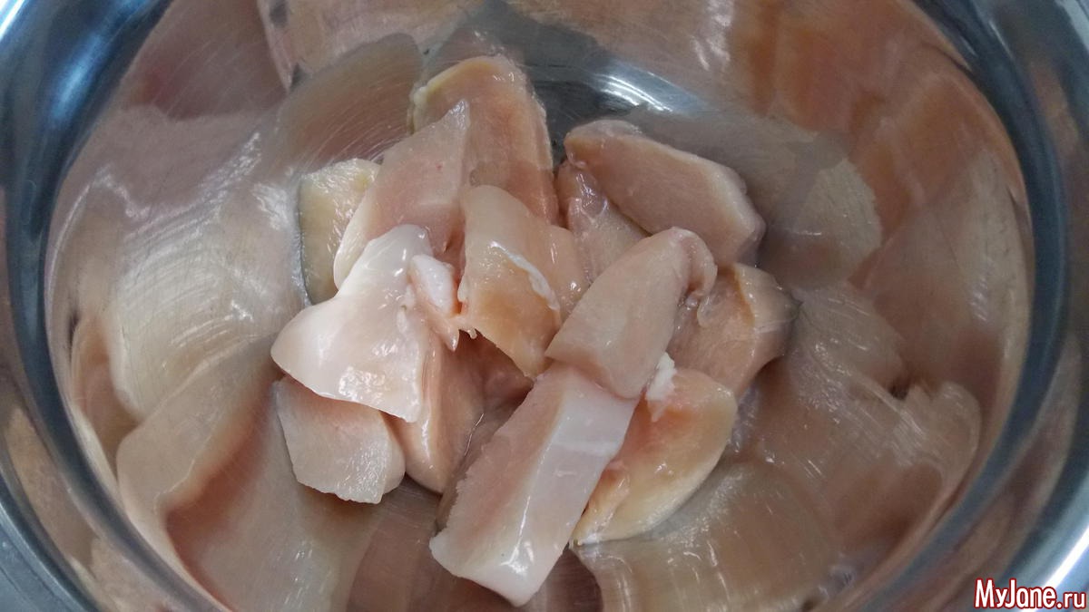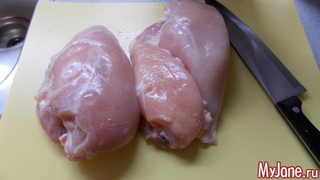 срежем мякоть с грудок, понятно удалив кожу и жир,