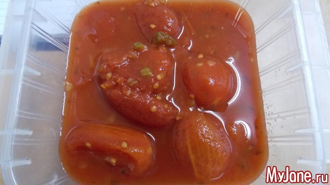 Все просто, 5-6 небольших помидоров. Содрать с них кожу, разрезать на потовинки, чеснок, специи, чуть чили, проварить 10 минут, все! Готово!