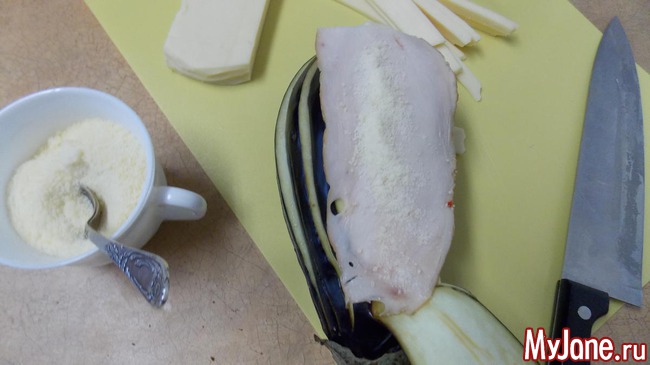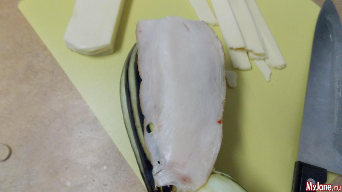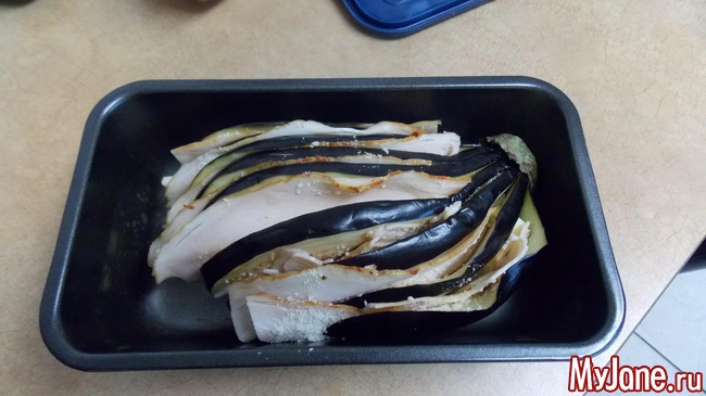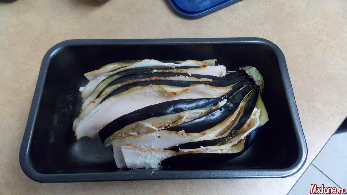 Порежем пластинками моцареллу, индюшачью грудку и подготовим пармезан, и просто начиняем слои, друг за другом