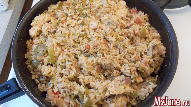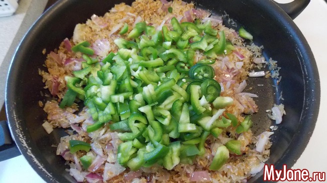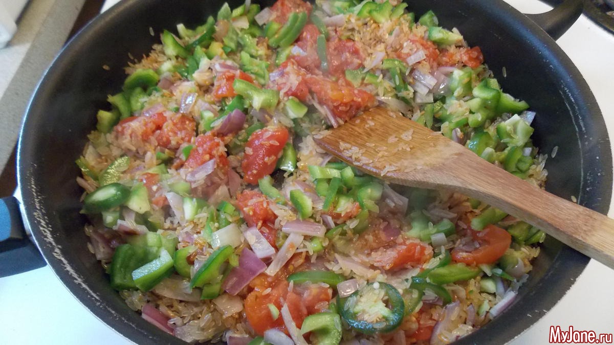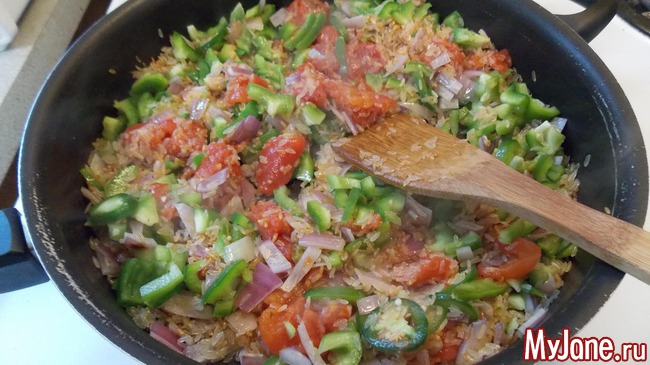 рис к тому времени уже позолотился (его надо помешивать, чтобы не пригорел)