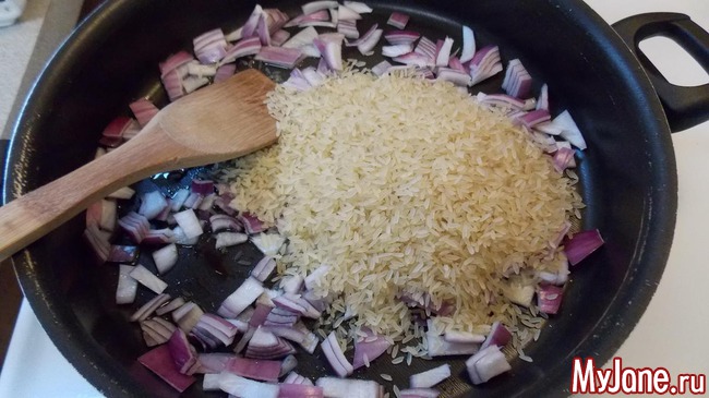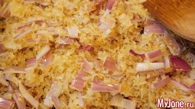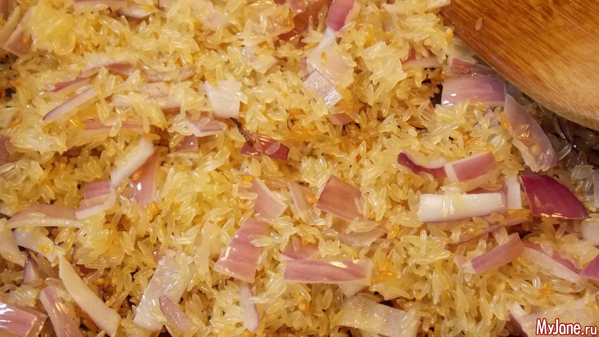 на дно сковородки наливаем масло, кладем лук и рис. Пожарим их вместе минут 5-7 рис должен стать золотистым.
