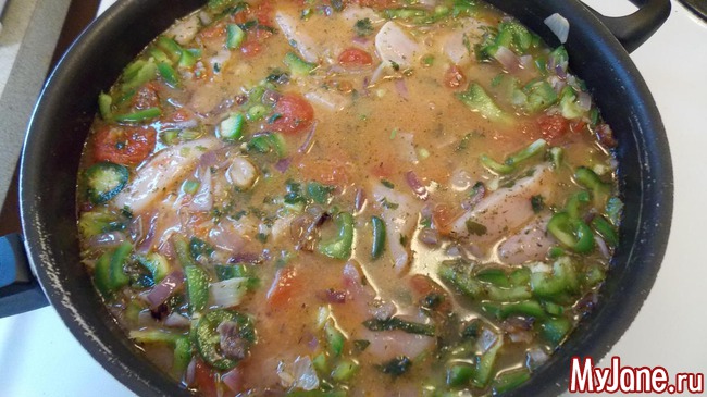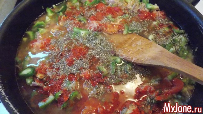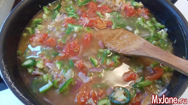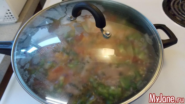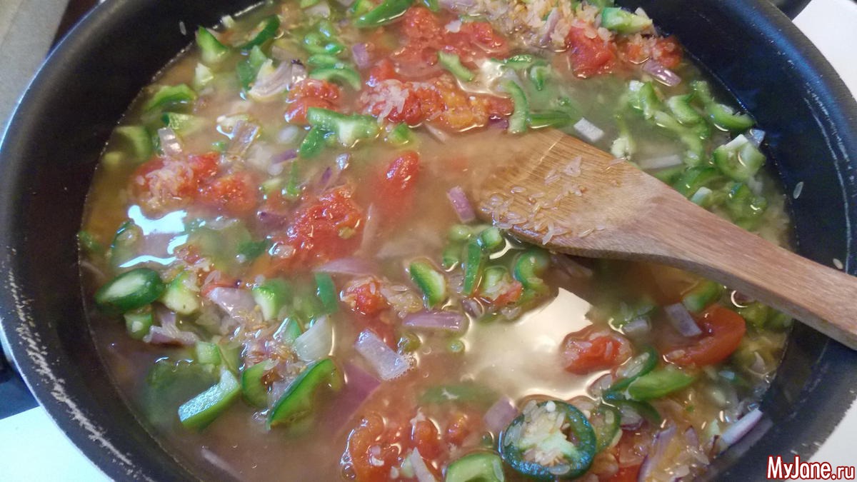закрываем крышку и томим на маленьком огне минут 30, пока рис не сготовится и жидкость почти не выпарится, иногда перемешиваем.