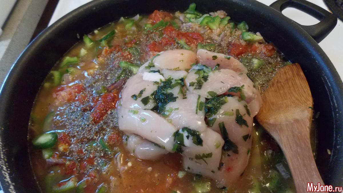 и чуть измельчим помидоры в соусе, можно чеснок или продавить или мелко порезать, если любите почесночней, я не клал, потому что в соусе он есть
