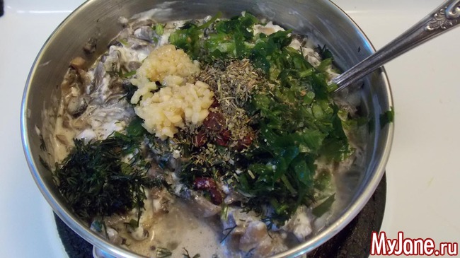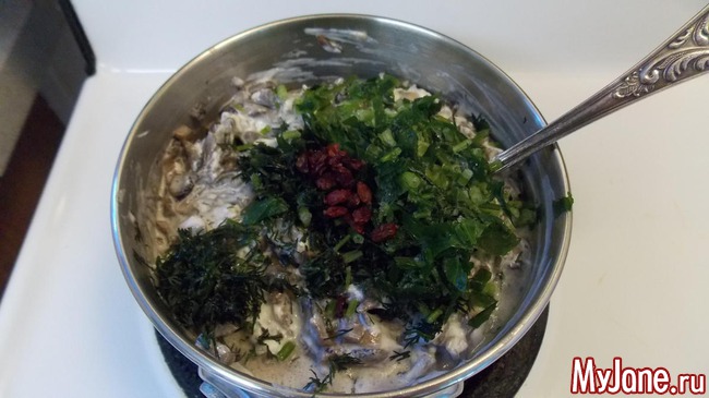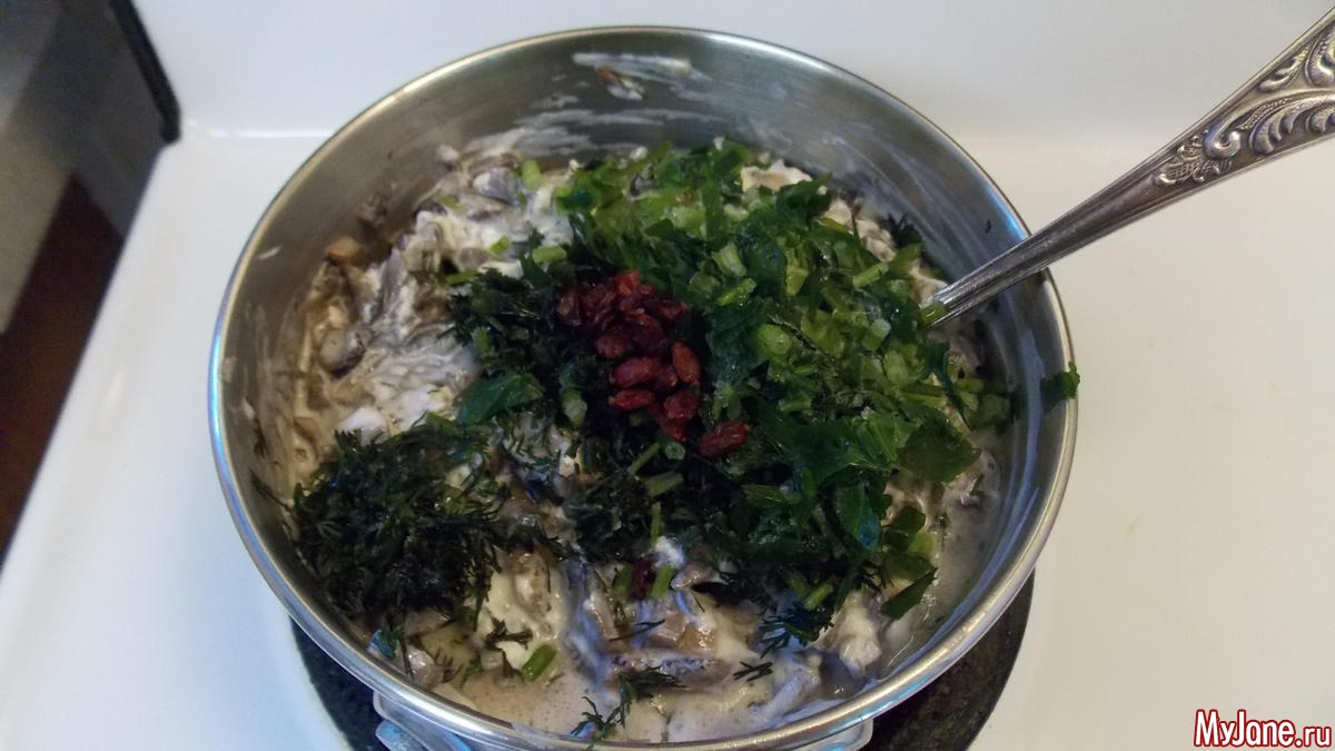 кладем сметану и сливки укроп, петрушку свежие, базилик и орегано сухие, и барбарис!!!