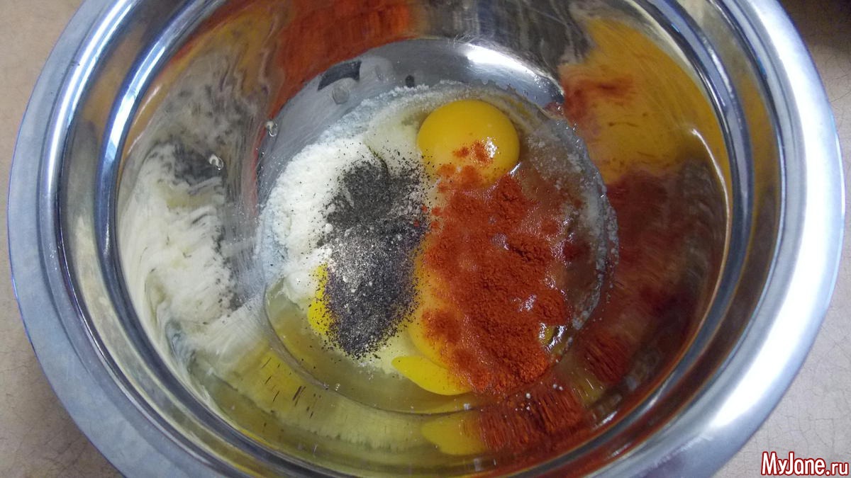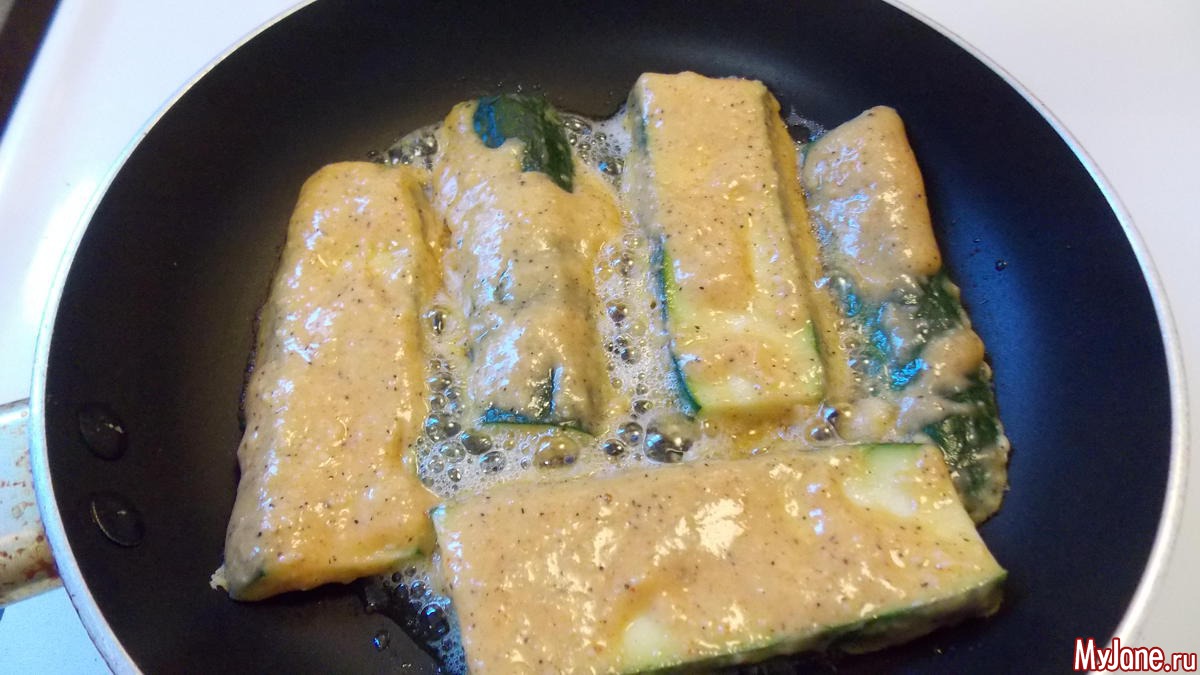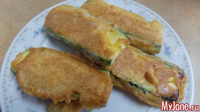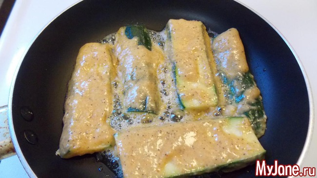 озваляем в кляре и на сковородку на средне-маленький огонь пожарим с двух сторон до золотистой корочки