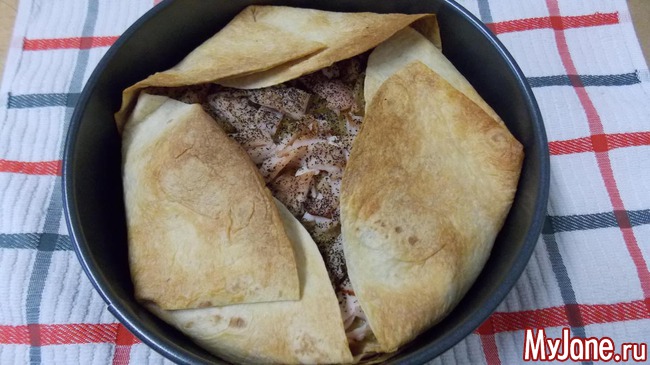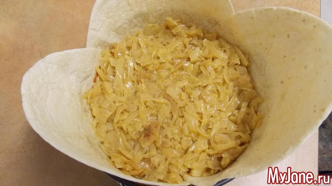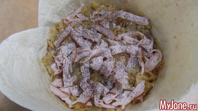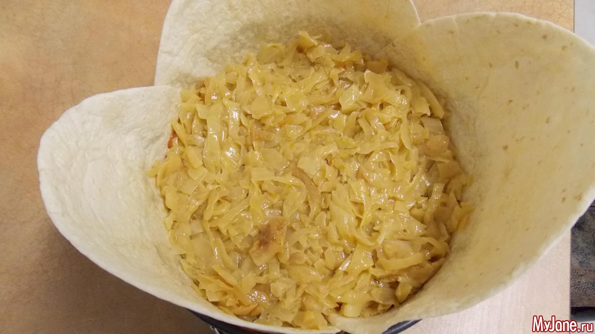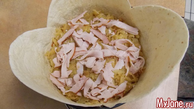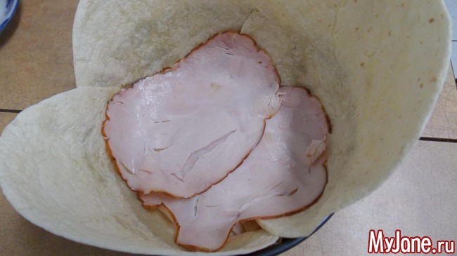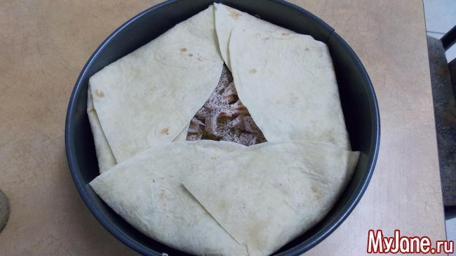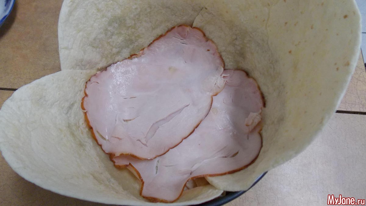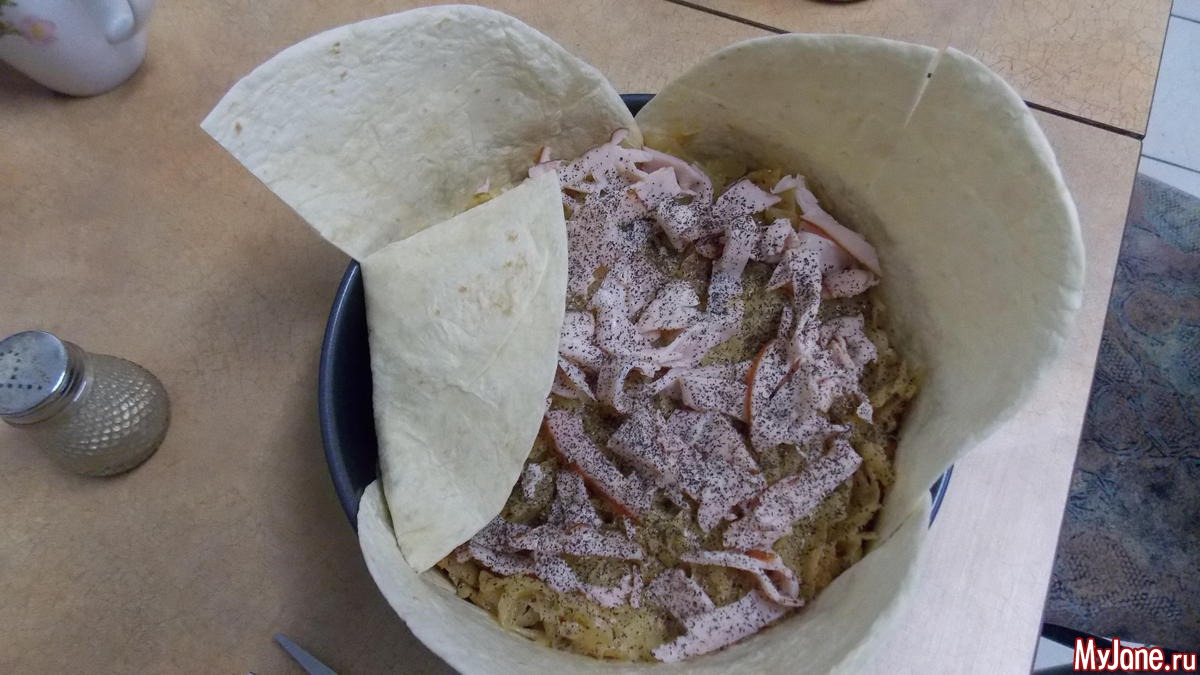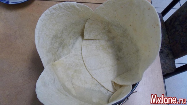 закрываем. Для этого тортиллу до бортика прорезать ножницами