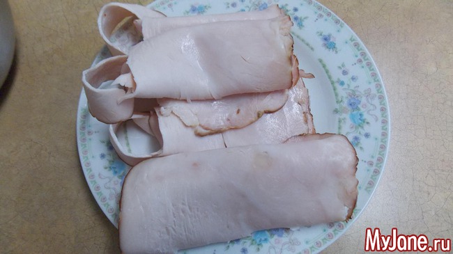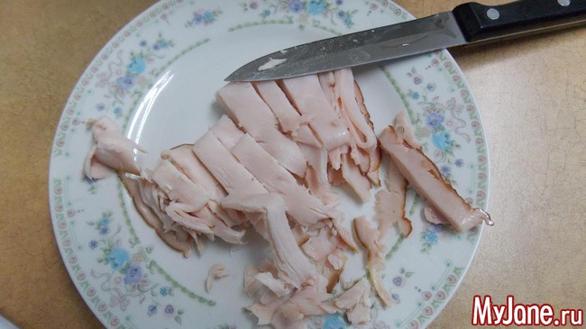 оставшиеся пару кусков нарезаем тонко и выкладываем на капусту