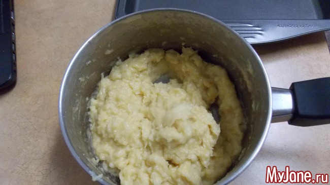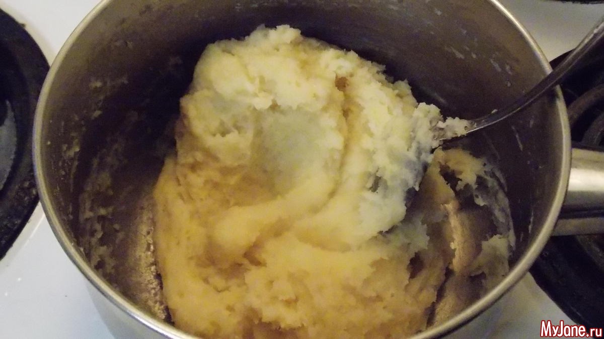 как только вода с маслом закипит, всыпаем муку и быстро замешиваем тесто