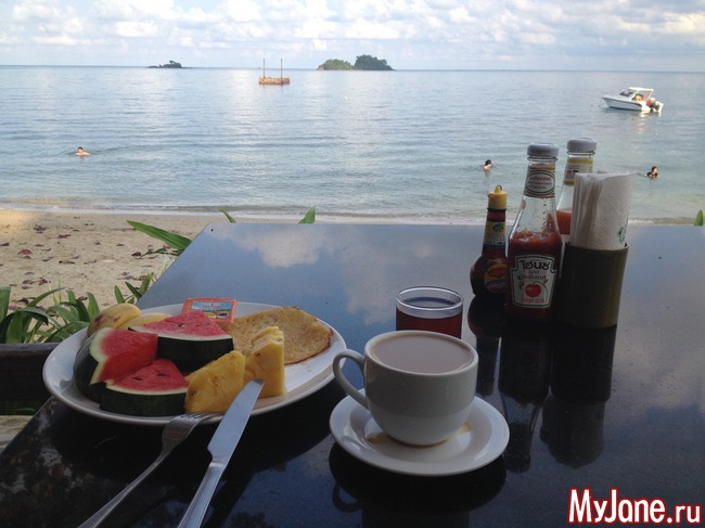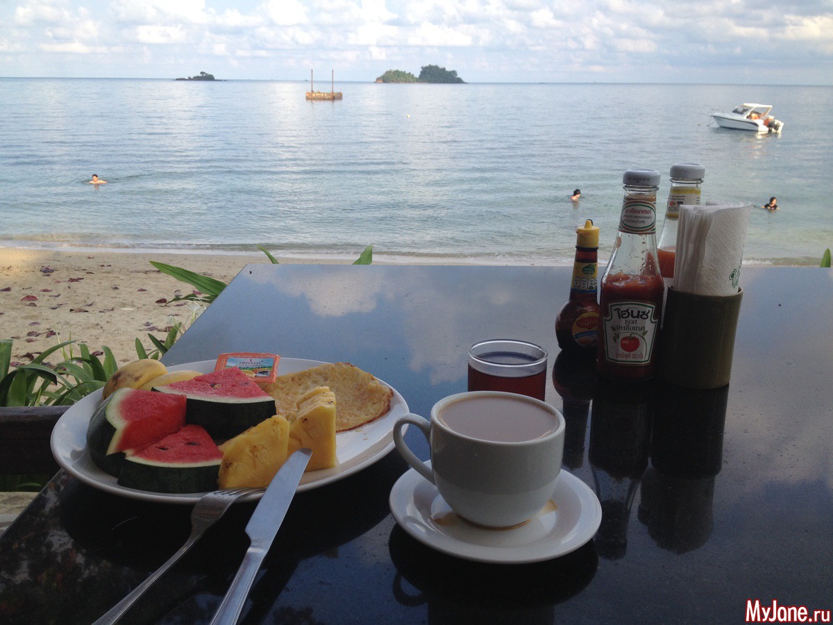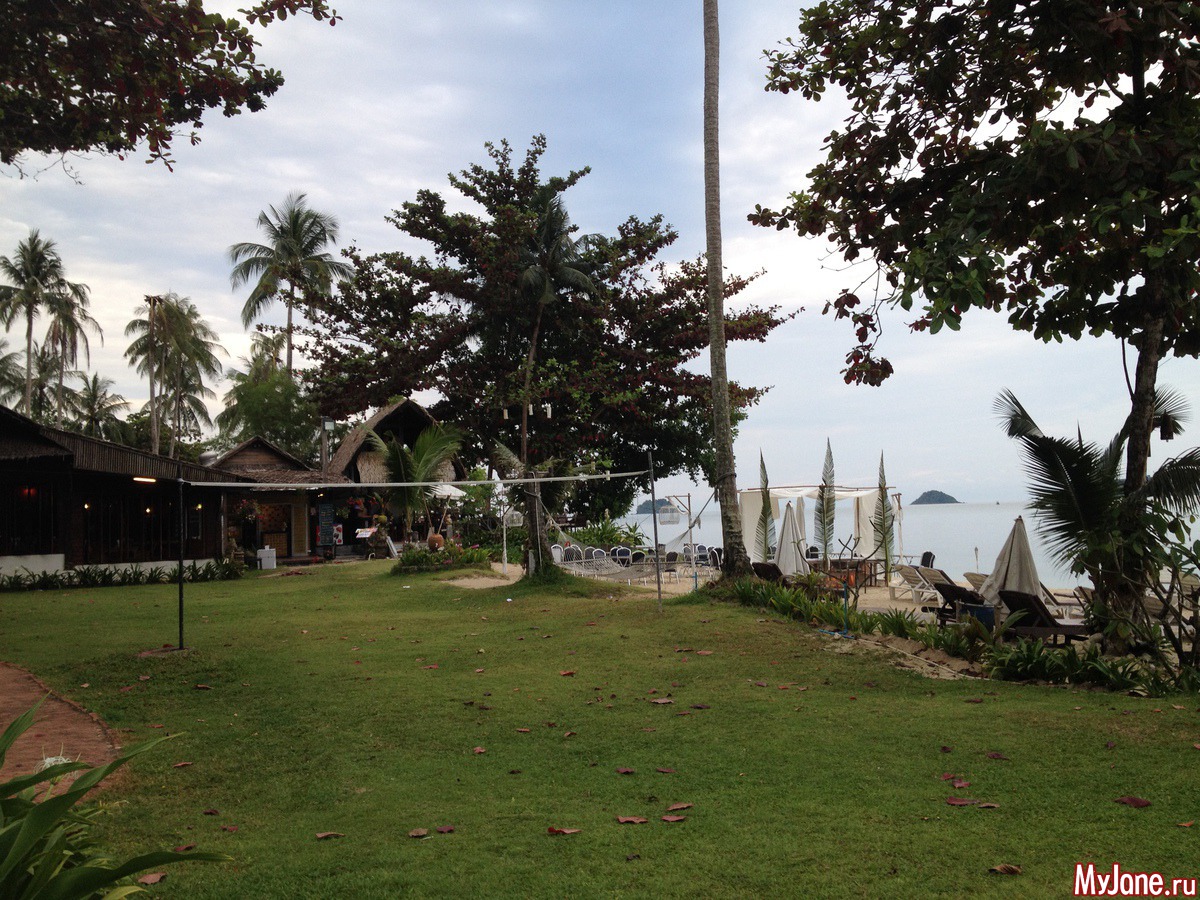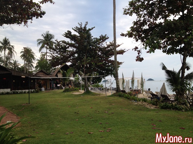 Волейбольная площадка и вид пляжа в другую сторону. Домик это кафе, в котором подавали завтрак.