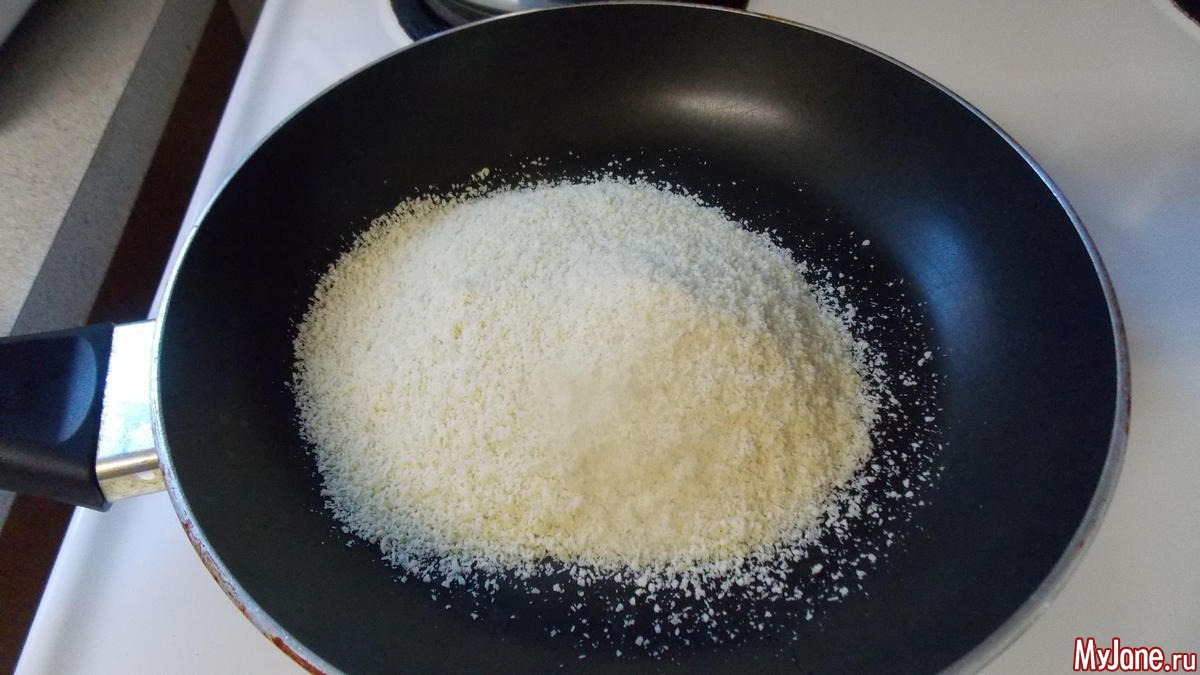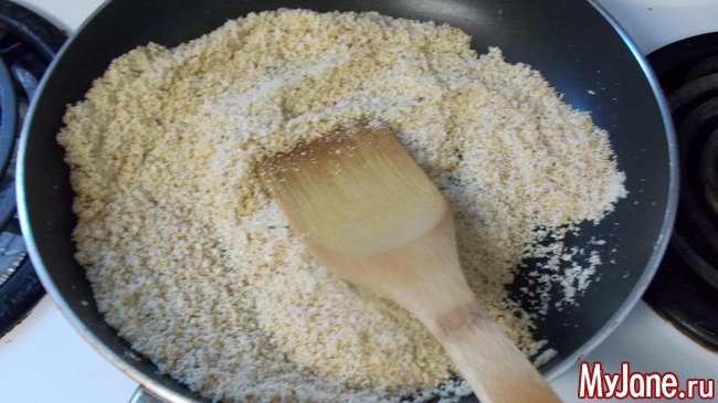 чуть подсушим миндальную муку на среднем огне до коричневатого цвета.
