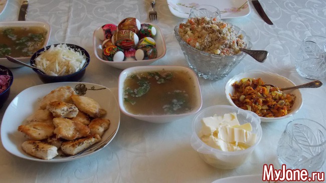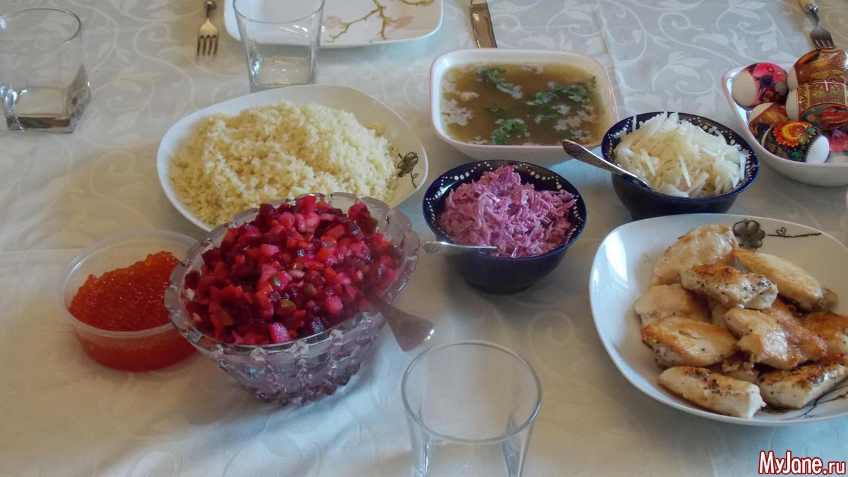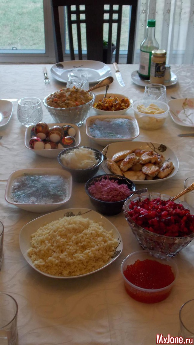 Оливье, винегрет, куриные грудки, рис с поджаркой, студень, несколько куличей оставил дома, пасху и салатики. Ничего особенного.