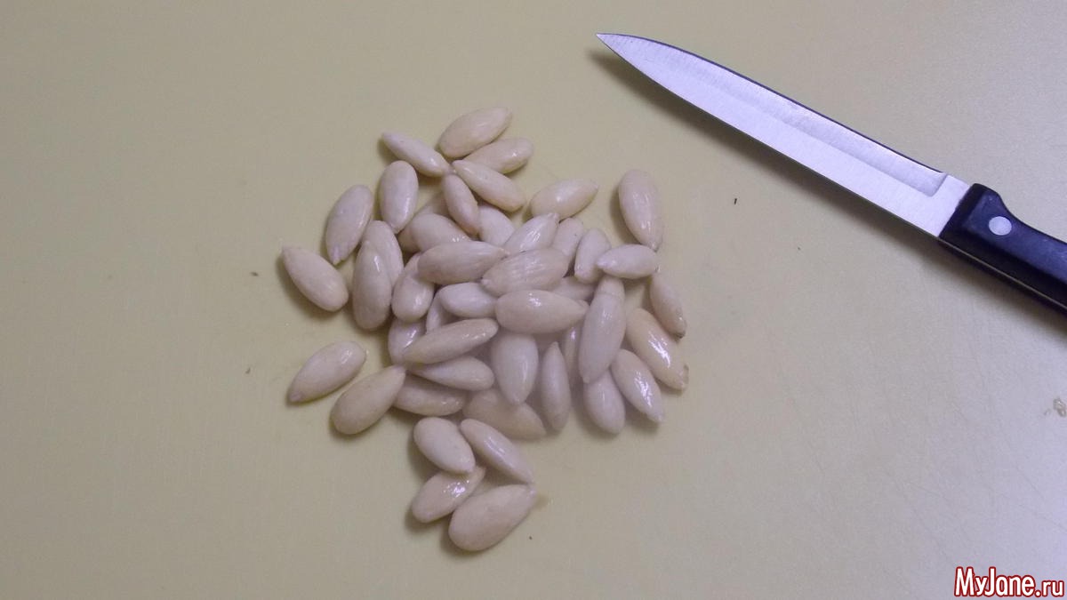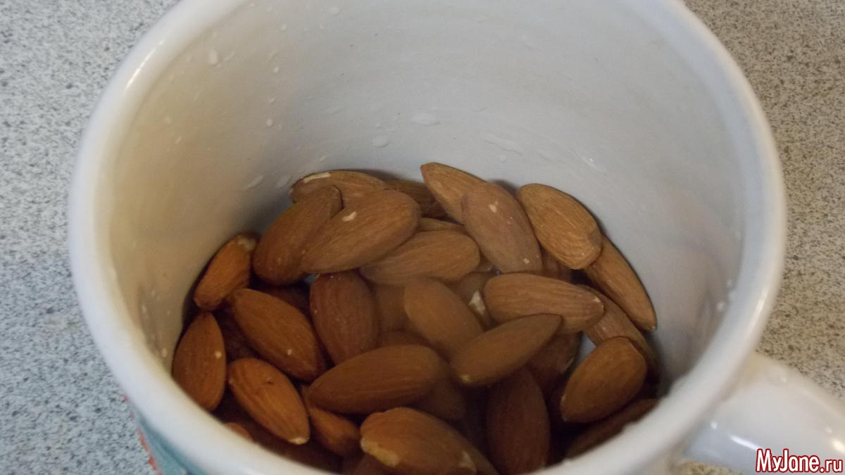 когда вода в чашке остынет, слить ее миндаль очистить от шкурки (просто надавить руками он сам выскочит)