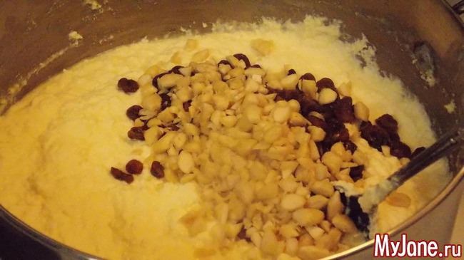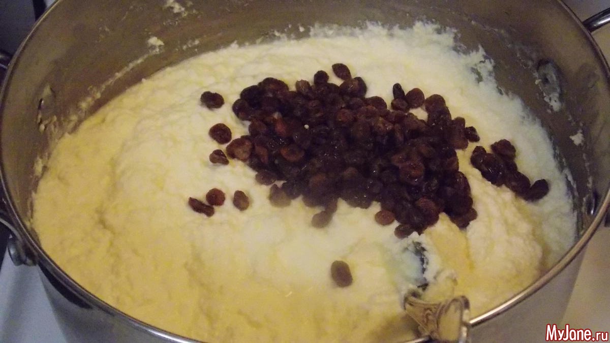 изюм высыпать в кастрюлю с пасхой