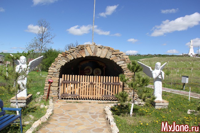 Вообще сооружение представляет собой церковь, на крыше которой размещен камень как символ Земли, а уже на нем скульптура Спасителя.