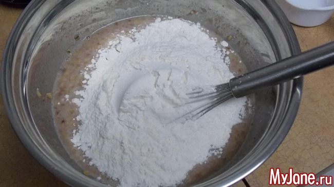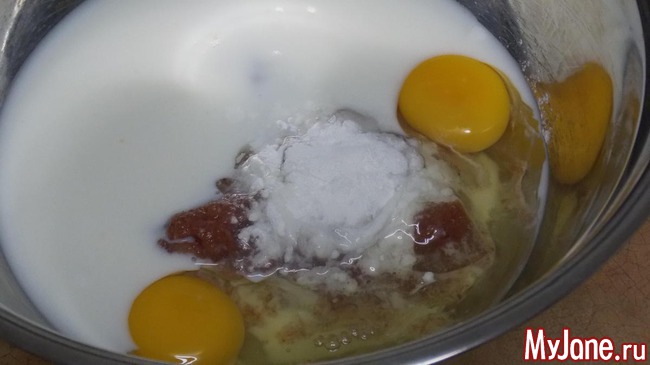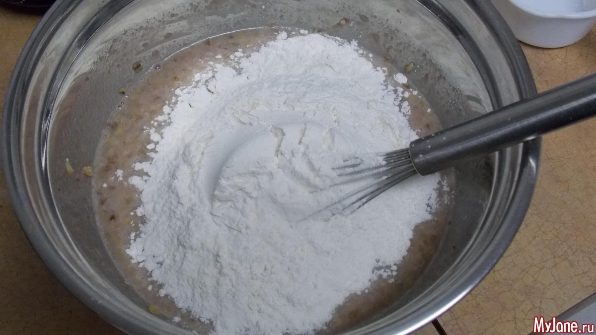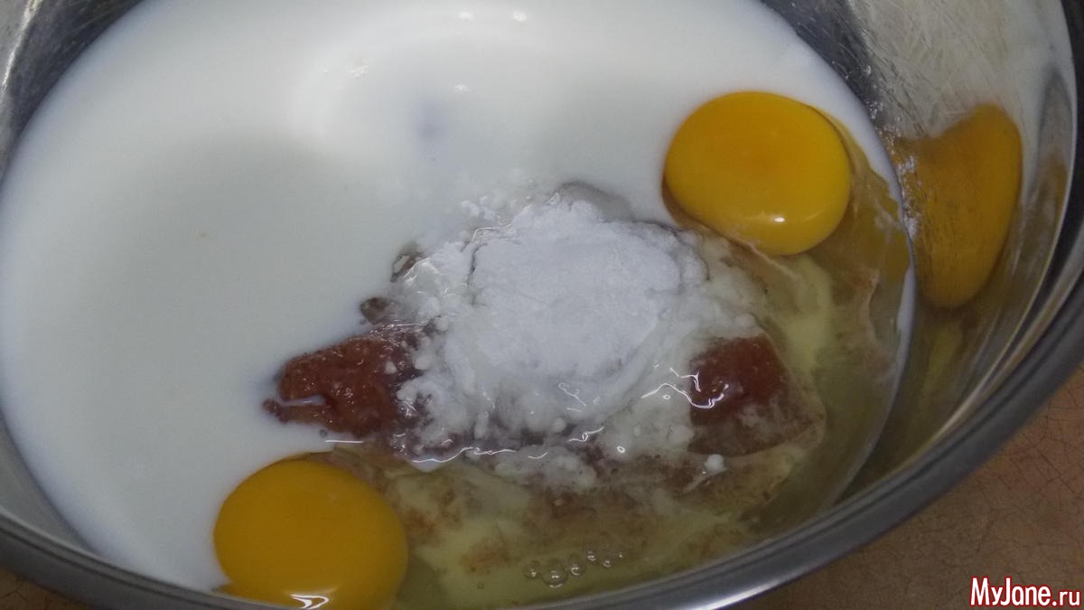 все выкладываем в миску. насыпаем разрыхлителя чайную ложку