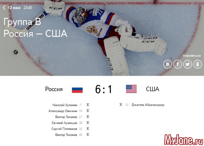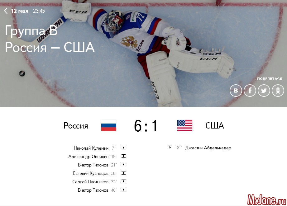 В понедельник сборная России по хоккею в рамках группового этапа чемпионата мира со счетом 6:1 разгромила команду США. В составе победителей шайбы забросили Николай Кулемин (7-я минута), Александр Овечкин (19, буллит), Виктор Тихонов (21, 40), Евгений Кузнецов (30), Сергей Плотников (32). Гол американцев записал на свой счет Джастин Абделькадер (21).