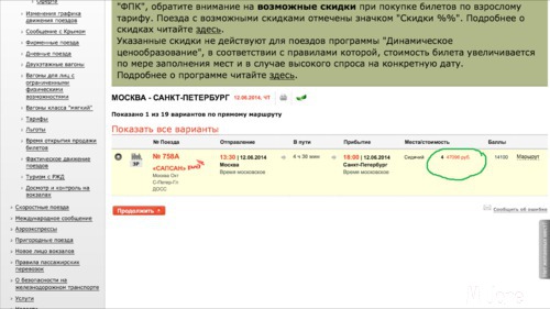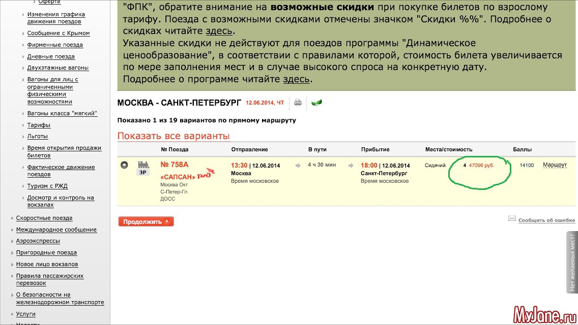 Смотрю Сапсан. Дневной поезд 12го июня из Москвы в Питер. Осталось 4 билета. Цена одного билета 47 тысяч!!!