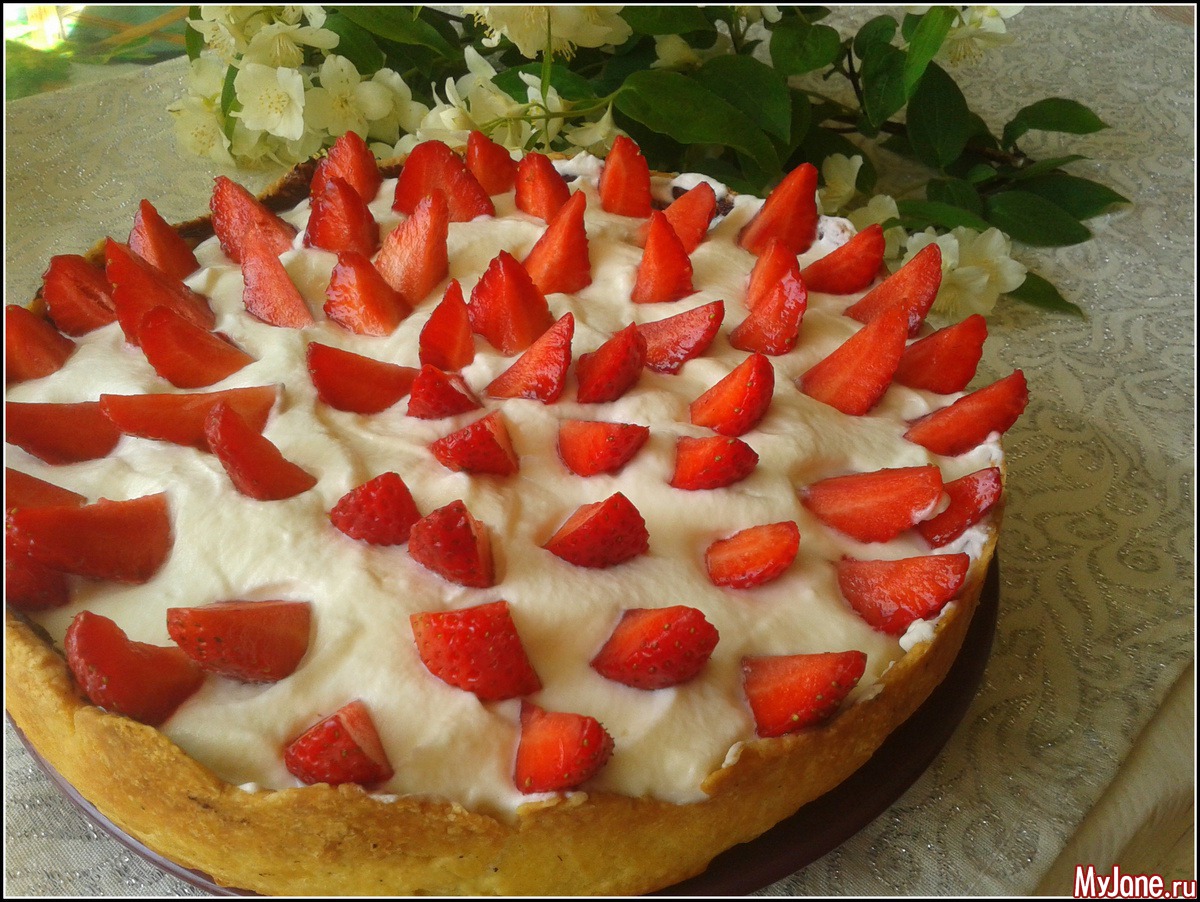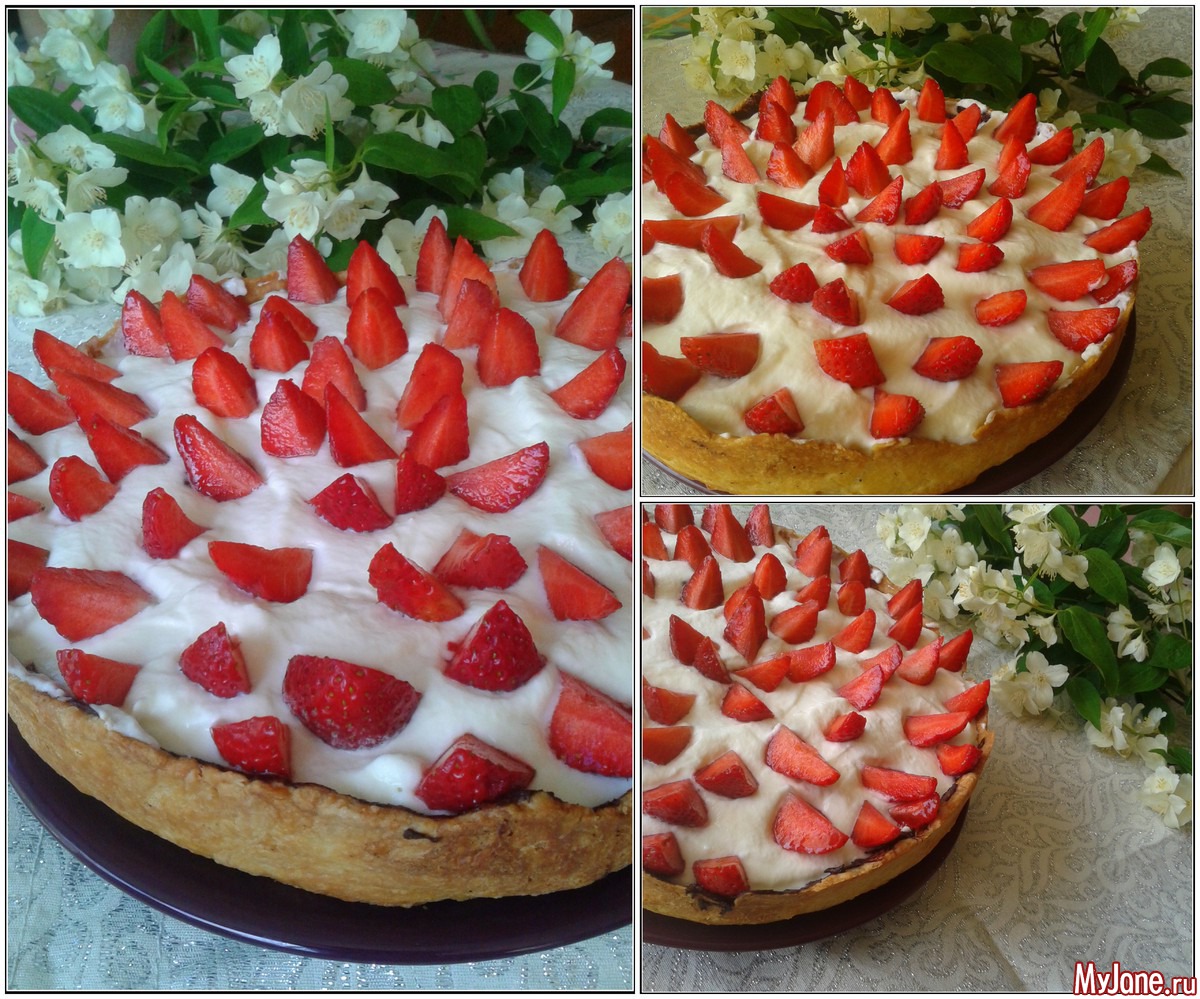 Для приготовления тарта нам понадобится рубленое тесто, сахарная пудра, мягкий некислый творог, густая сметана, шоколад, клубника.