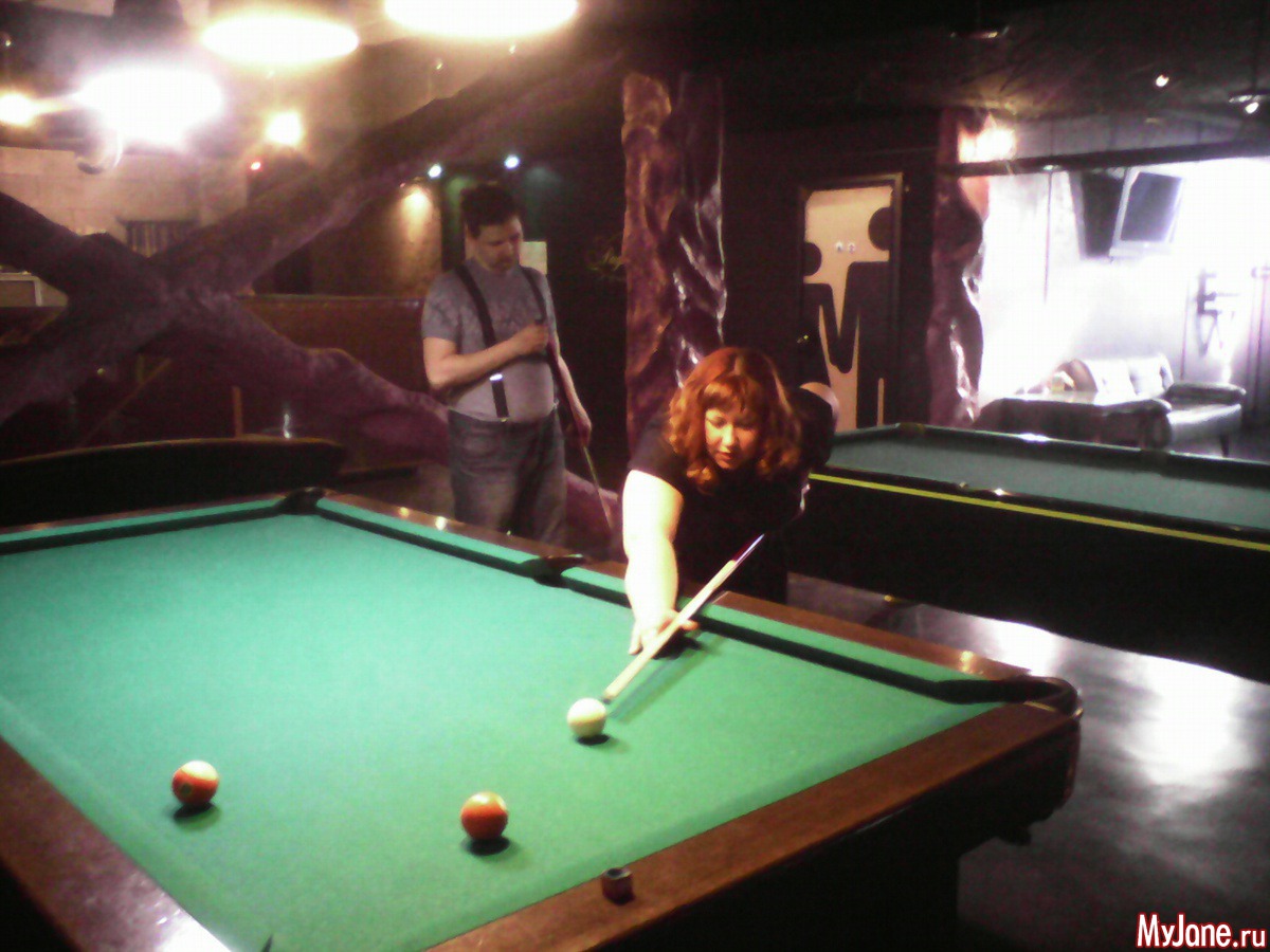 Бильярд втроем - это, конечно, забавно! Еще наш стол был как медом намазанный для мальчика лет 5-6, который учил нас играть в бильярд ("чтобы попасть в дырку, надо в нее целиться" ), закрывал лузы руками, доставал из них шары и двигал шары на столе. Мама играла в боулинг, а ему было неинтересно. Паренек, который следил за порядком, пару раз уводил мальчика, но через 2-3 минуты малыш возвращался и продолжал свои уроки