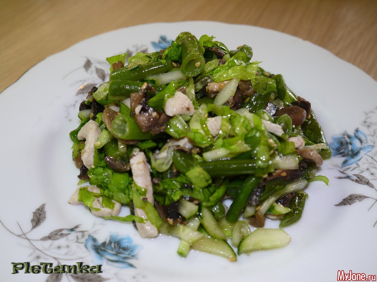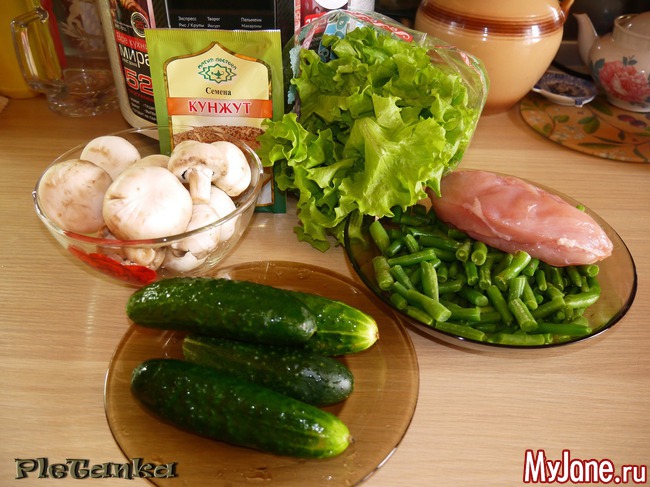 Подготовили продукты: куриная грудка, мороженная зеленая фасоль, шампиньоны свежие, кунжут (10г), листья салата, огурцы