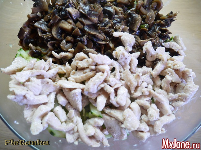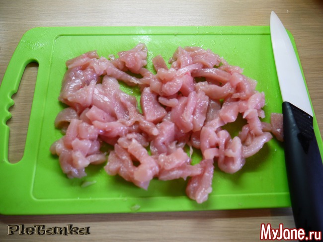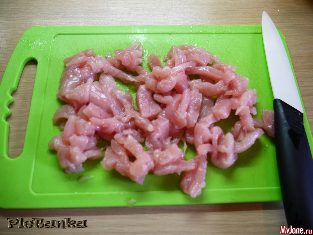 Грудку порезать соломкой, посолить, поперчить и потушить (при желании чуть поджарить, но не пересушить её) в той же сковороде. При необходимости добавить чуть раст. масла.