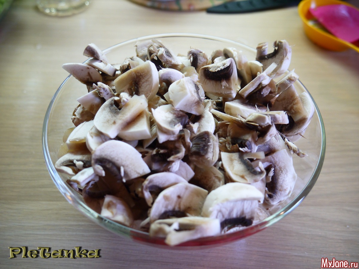 Грибы порезать, посолить и обжарить пока не выпарится вода с них.