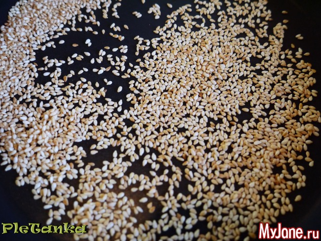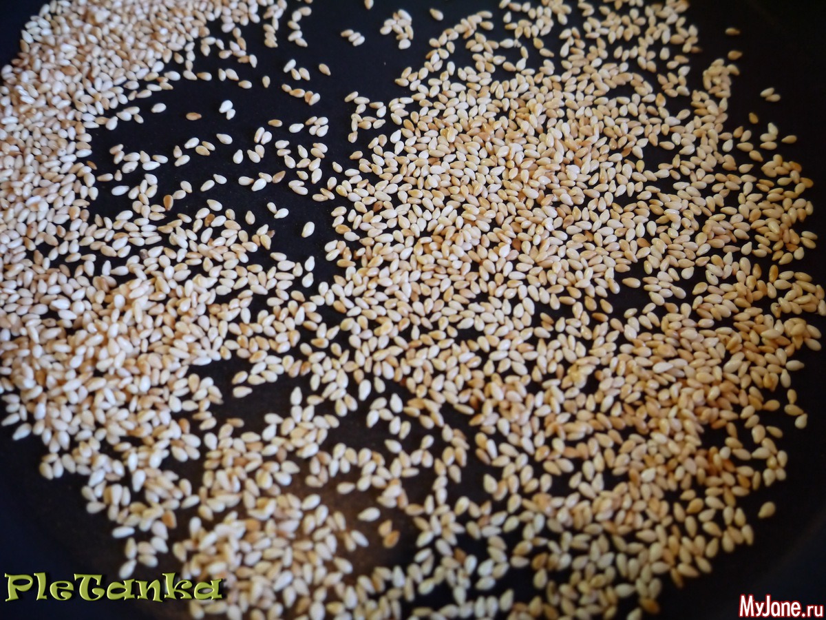 На сухой сковороде в течении 5 секунд обжарить кунжут.