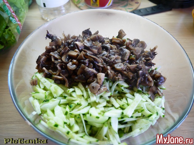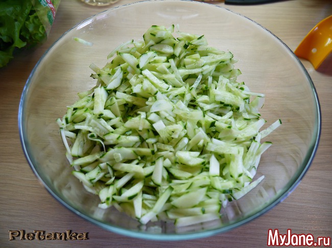 Пока жарится мясо с грибами, нарезаем огурец соломкой.