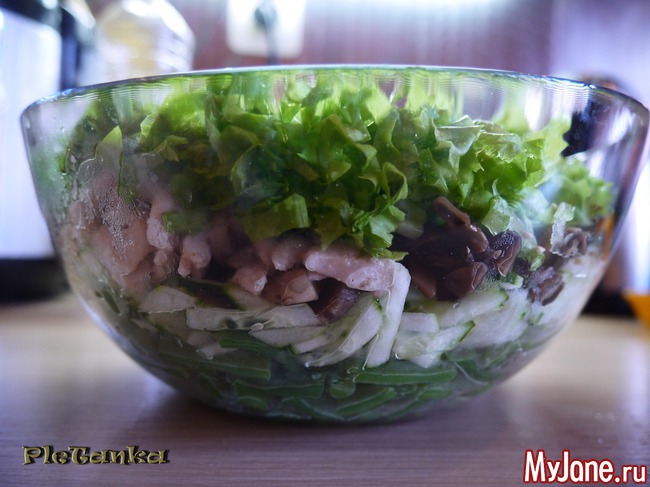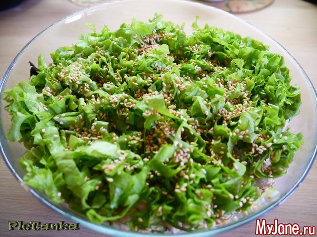 Листья салата нарезать соломкой и накрыть наши ингредиенты. Посыпать кунжутом и оставить на 20-40 минут.