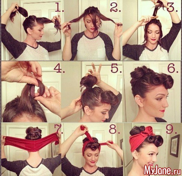 Стиль ретро всегда актуален, поэтому предлагаем Вам следующий вариант. Для этого вам понадобится небольшая шейная косынка или шарф (имеется в виду шелковый платок или любой другой из легкой ткани). Так как платки имеют свойства сползать, лучше закрепить их невидимками.