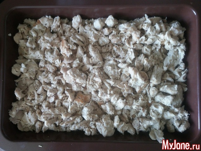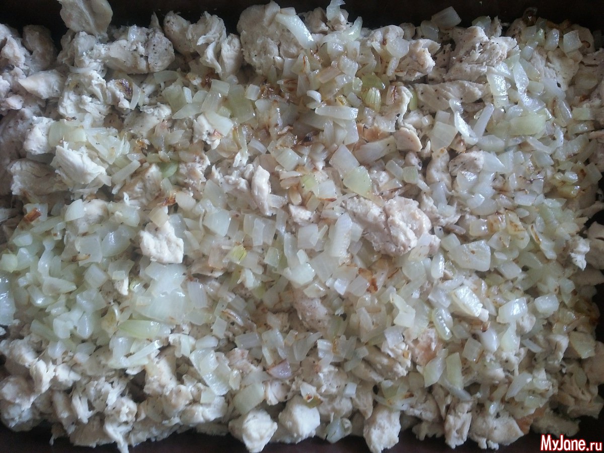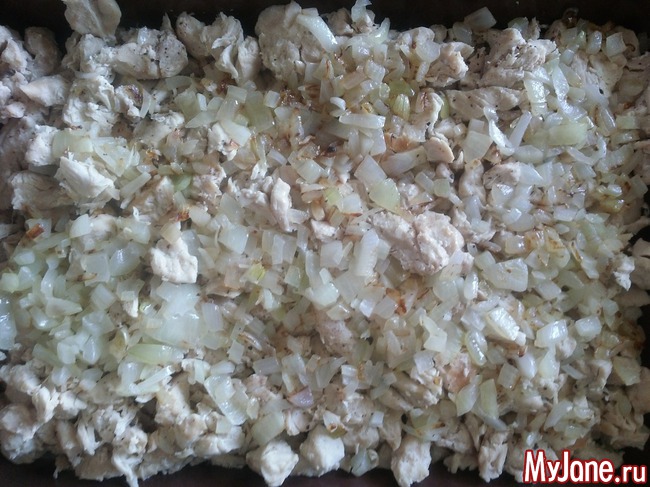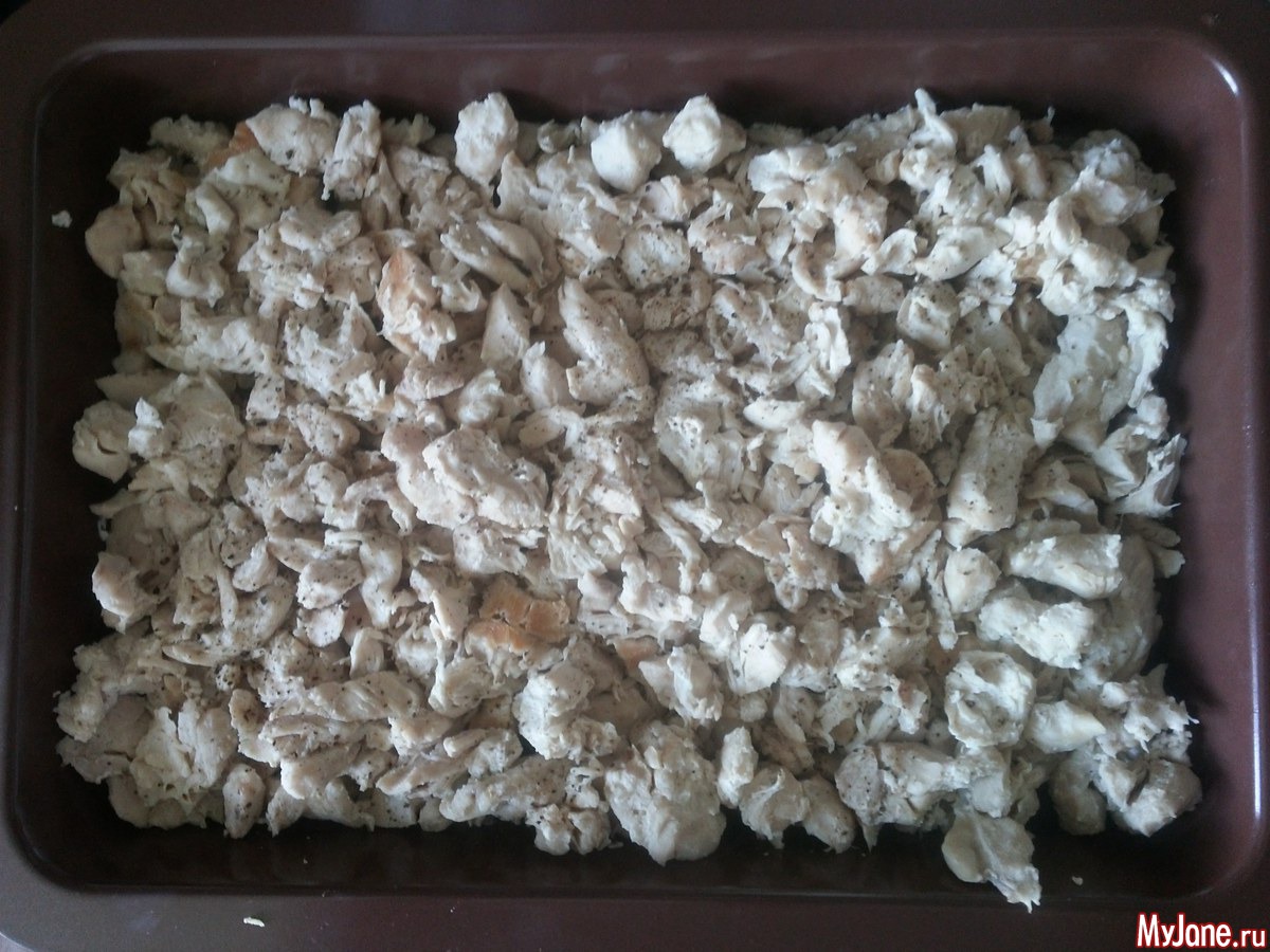 Куриные грудки были порезаны кусочками. И их стушила мультиварка. Т. е. без капли масла.