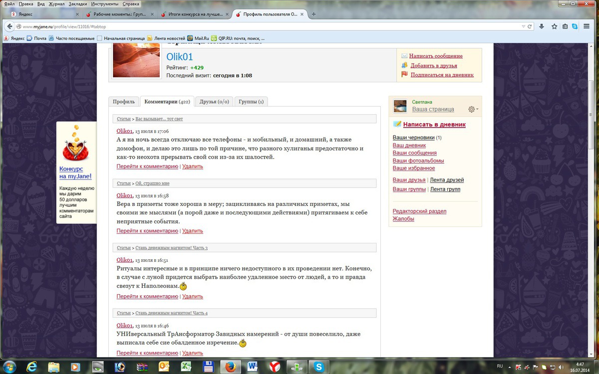 Если вы говорите победительнице конкурса Olik01, то за последнюю неделю наша система зафиксировала 140 комментариев от данного пользователя.