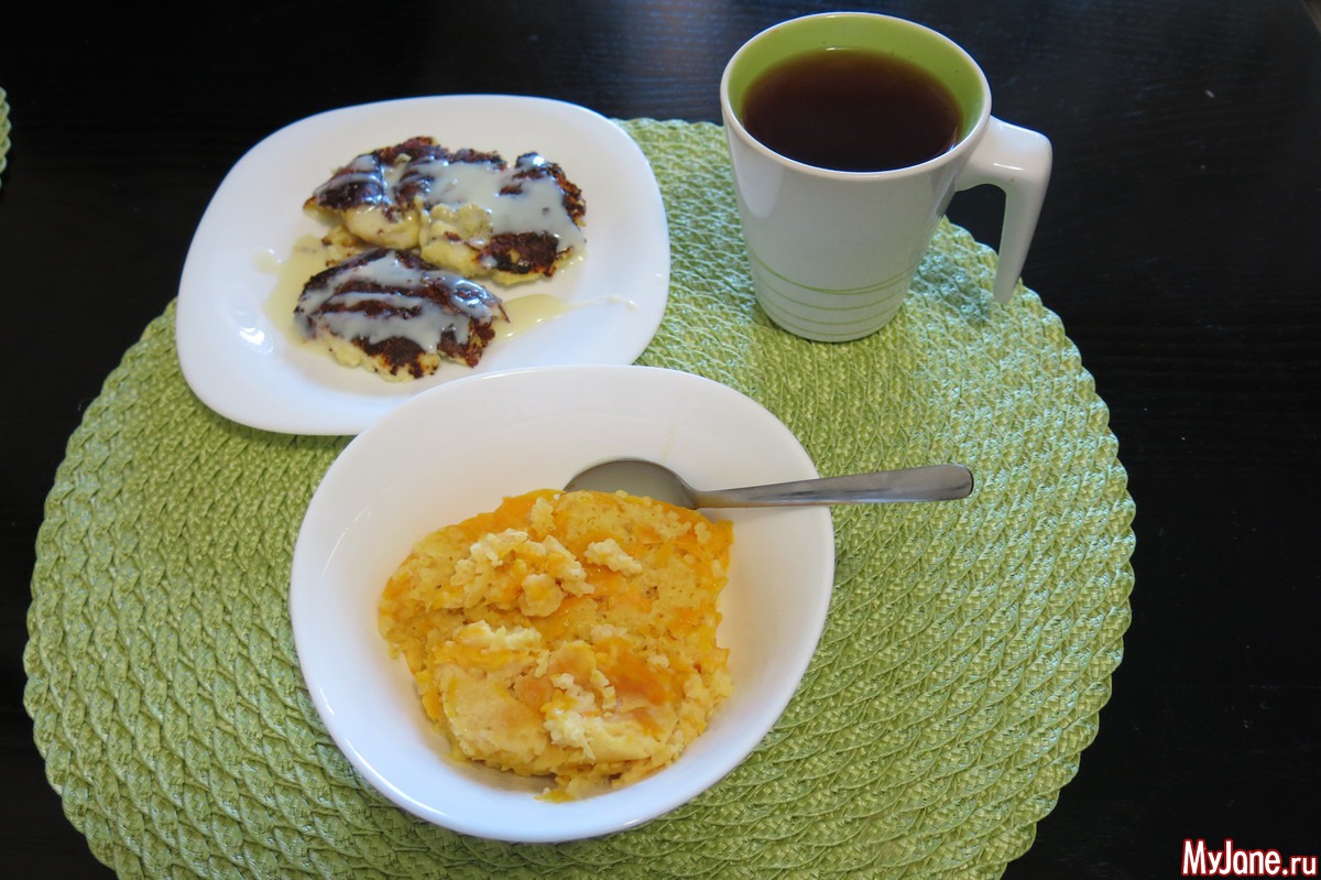 пшенная каша с тыквой, три сырника со сгущенкой, чай