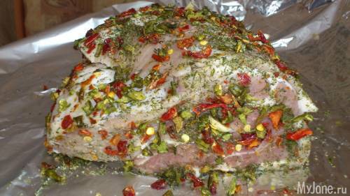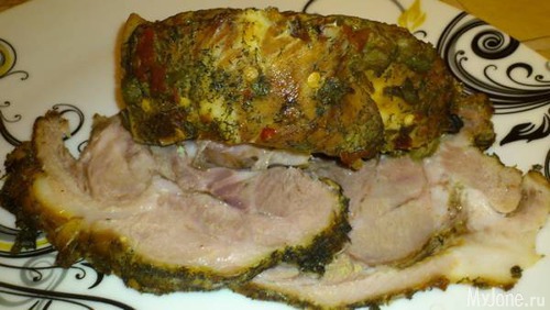 В маринад добавила при варке смесь из сладких перцев. А так же перед выпечкой обваляла кусок мяса в смеси перцев сладких, и разных специй. Можно так же обваливать мясо в красном перце, тогда корочка будет красной.
