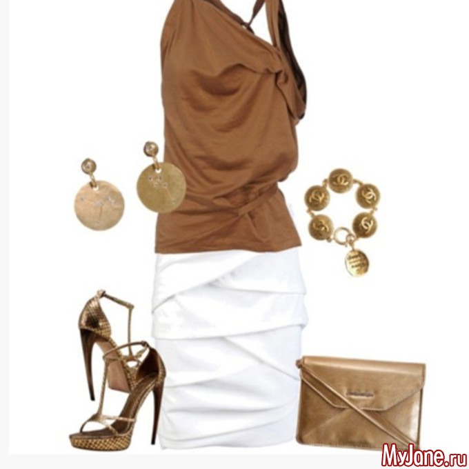 6.) Жарким летним вечером с белой юбкой будет отлично смотреться золотой топ на тонких бретелях в сочетании с золотистыми плетеными сандалиями.