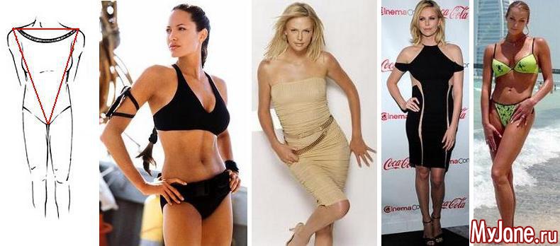 Фигура характеризуется широкими плечами и узкими бёдрами. Выраженная талия отсутствует, зауженные бёдра, плоские ягодицы и большая грудь. При такой комплекции, массивный верх очень часто сопровождается длинными, стройными ногами. Многие спортсменки имеют такую фигуру.