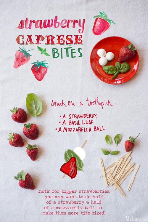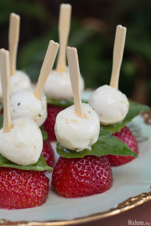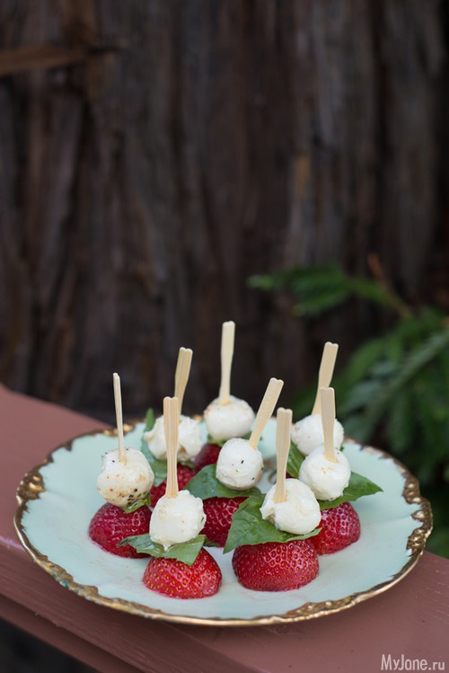 Увидела вчера вот такую необычную закуску - "Клубничное капрезе" (клубника, моццарелла и базилик):