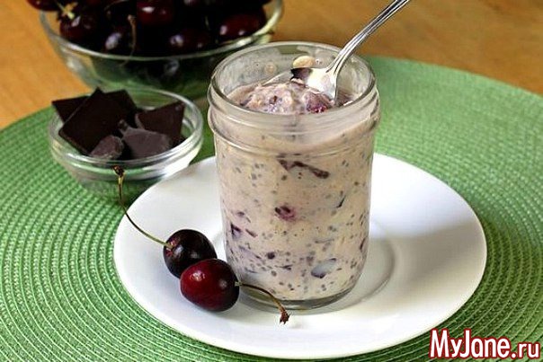 Овсянка в банке с вишней и шоколадной крошкой.