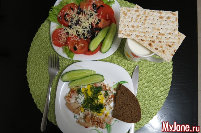 филе индейки с яйцом, кусочек хлеба, овощи (огурец, помидор, салат, базилик, 1 ч. л. льняного масла, сыр), два хлебца, кефир