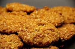 Перемешайте сахар с хлопьями, кокосовой стружкой и мукой в большой миске. Влейте масляный сироп, хорошенько размешайте, чтобы получилось тесто.