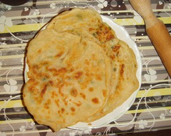Выкладываем ее на раскаленную сковороду и жарим на довольно большом огне минуту. Переворачиваем, смазываем сторону растительным маслом и через минуту опять переворачиваем. Смазываем вторую сторону и спустя минуту опять переворачиваем. Снова жарим минуту.