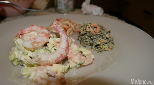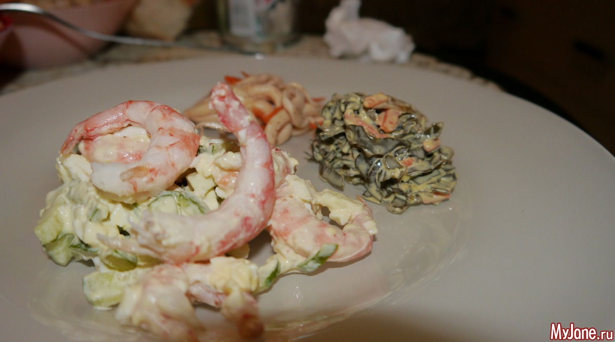 Салат с креветками , яйцом и зеленью, морская капуста с сыром и майонезом (ужины у меня не обходятся без неё в последнее время, тянет на неё жутко, но стараюсь покупать без майонеза, а тут захотелось такую) и маринованные щупальца кальмара с морковкой по корейски