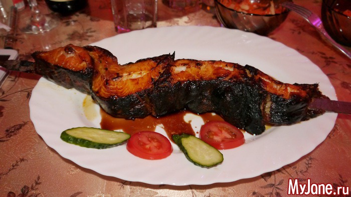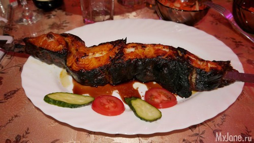 немного зажарили, но вкуснющие до ужаса были! Это блюдо опять же большое, и куски палтуса нанизаны на шампур. Кстати, корочка шикарная- я её...съела)))