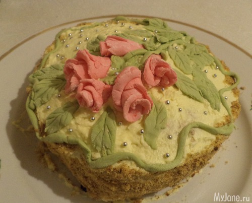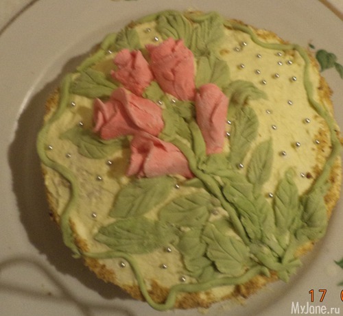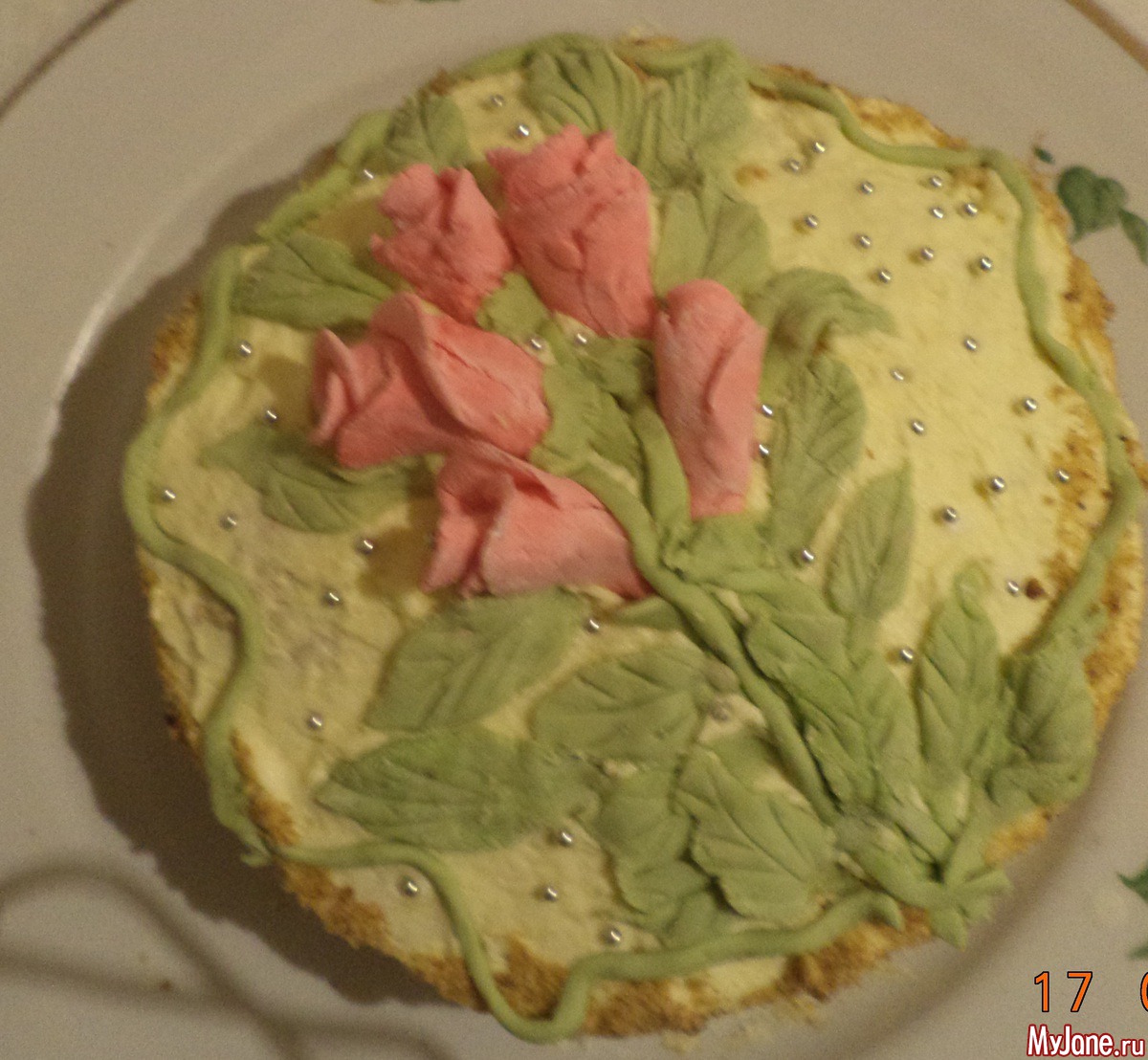 Вот и я решилась показать свой скромный тортик.Внутри из песочного теста,Крем заварной,а сверху украшен розочками из сахарной мастики.
