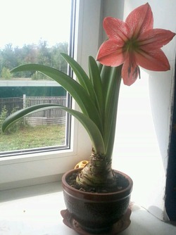 2,5 месяца эта луковица провела на клумбе в саду вместе со своей одногодкой и годовалой деткой, начало лета было солнечным и жарким, листья сварились очень быстро, после этого около двух месяцев большие луковицы просуществовали в безлиственном состоянии, а к середине августа вдруг проклюнулись листья и из самой крупной показался кончик стрелки цветоноса. Ночами было уже довольно прохладно, и я пересадила луковицу в горшок и занесла в дом.