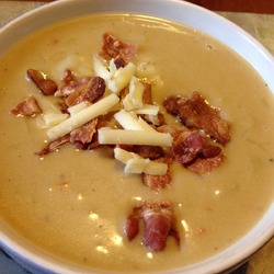 3. горстями добавлять сыр перемешивая. надо чтоб сыр растаял но суп не закипел. как только весь сыр добавлен и растял суп готов. подавать посыпав крошкой обжаеного бекона.