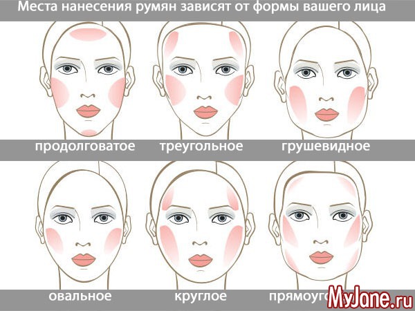 Как правильно определить область нанесения румян? Здесь используйте простой способ - подойдите к зеркалу и широко (но естественно) улыбнитесь. Улыбка выделит контур скул, на который и следует наносить румяна. Если же вы, нанося румяна, хотите еще и подкорректировать форму вашего лица, сделать его более гармоничным, смотрите фото - там указаны зоны, куда нужно наносить румяна женщинами с разной формой лица.