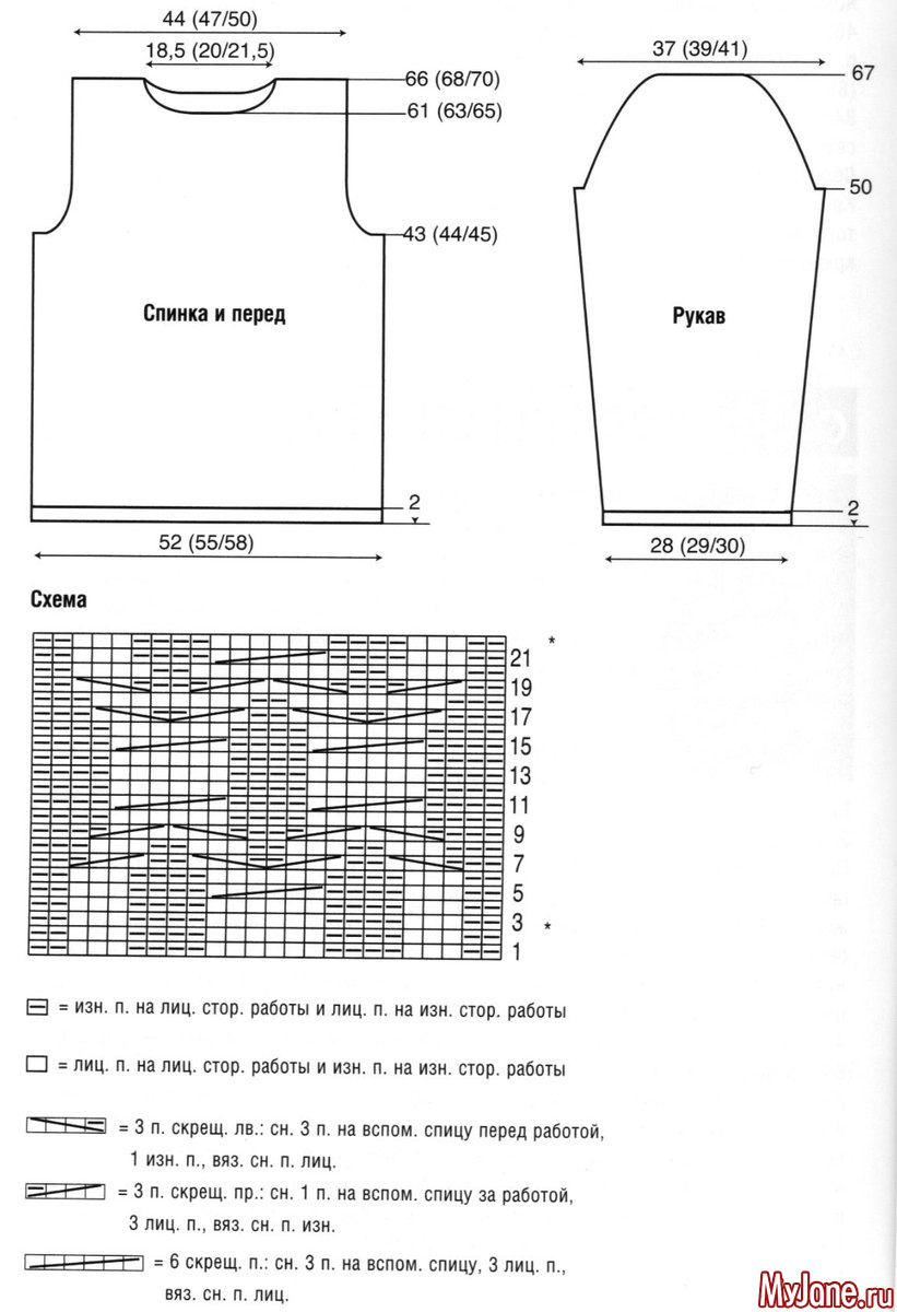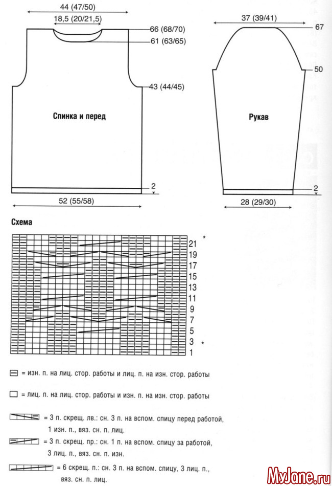 Узор «Жгуты»: вяз. по схеме и описанию (раппорт 24 п. и 20 р.): 1-й р.: 2 изн. п., 3 лиц. п., 4 изн. п., 6 лиц. п., 4 изн. п., 3 лиц. п. и 2 изн. п. 2-й р. и все чет. р.: вяз. по рисунку. 3-й р.: вяз., как 1-й р.