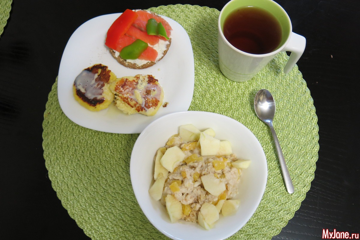 овсянка с тыквой и яблоком, бутер (хлебец+рикотта+красная рыба+огурец), два сырника с ложкой сгущенки, чай