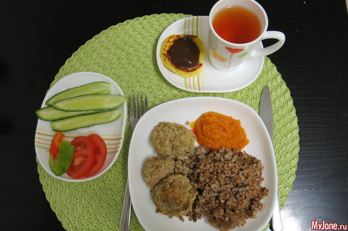2,5 котлетки из индейки, гречка, икра кабачковая, овощи, сырник с пюре из чернослива, чай
